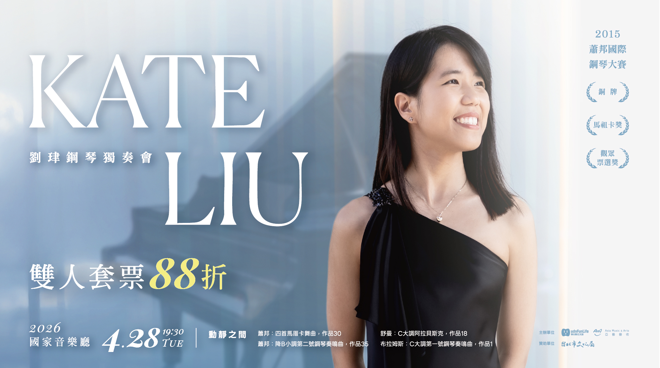 繼2024年首度來台後,Kate Liu將於2026年在台灣二度舉行鋼琴獨奏會,除了備受好評的蕭邦四首馬祖卡舞曲(作品30)之外,也將帶來溫柔且內省的舒曼C大調阿拉貝斯克,並以蕭邦第二號、布拉姆斯第一號,分別展現充滿深沉樂思與雄渾結構的浪漫樂派重量級鋼琴奏鳴曲。