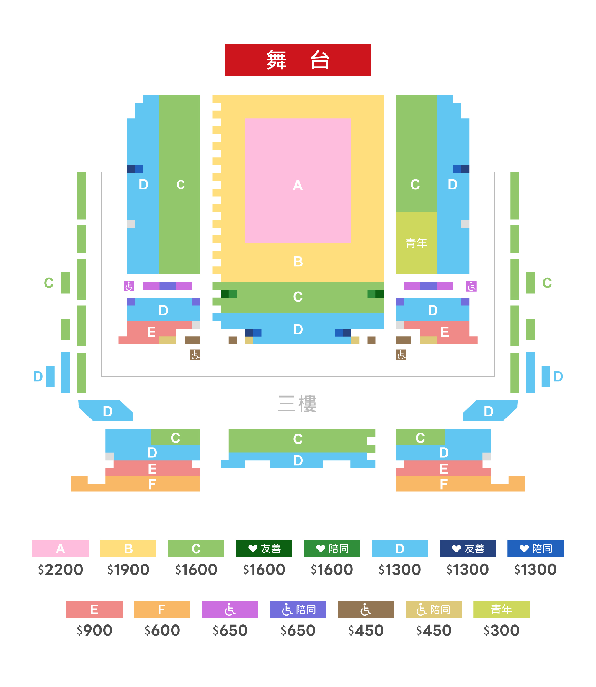 $2,200/ $1,900/ $1,600/ $1,300/ $900/ $600 (多元友善席、友善陪同席$1,600、$1,300;輪椅席、陪同席$650、$450;青年席:$300)