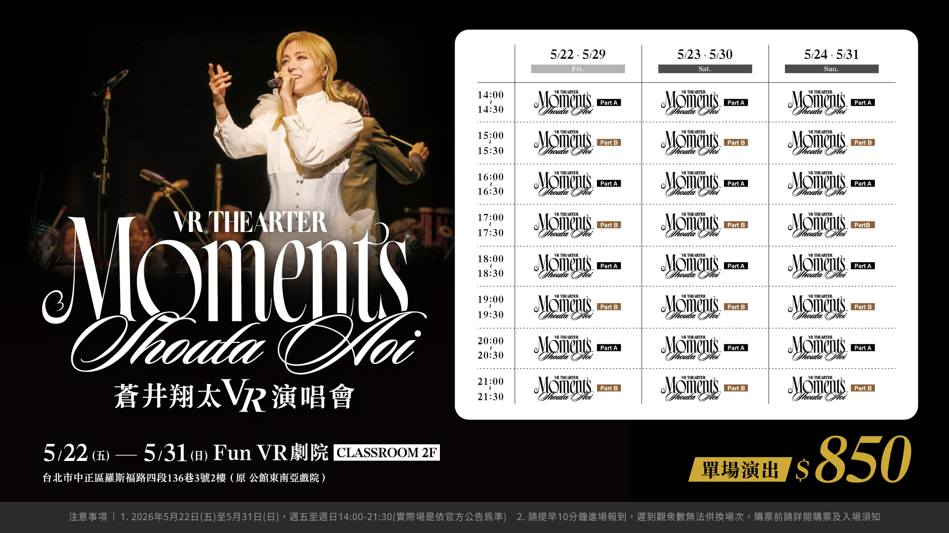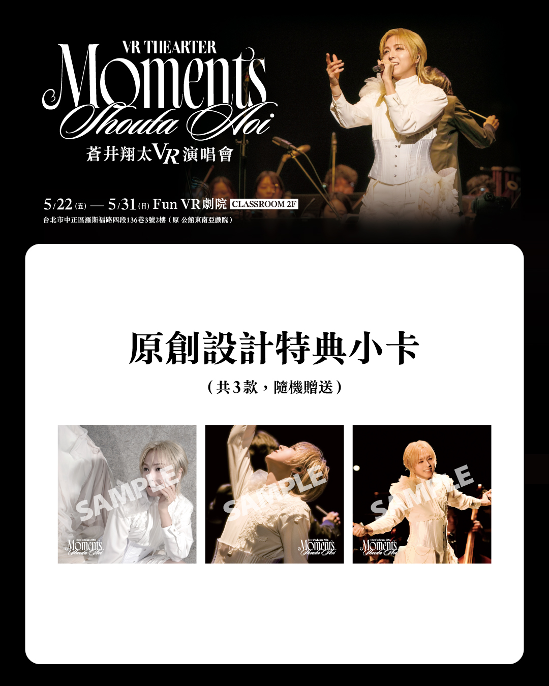 凡購票觀眾入場後,現場將贈送「蒼井翔太 VR THEATER Moments」原創設計特典小卡乙張(共3款,隨機贈送)