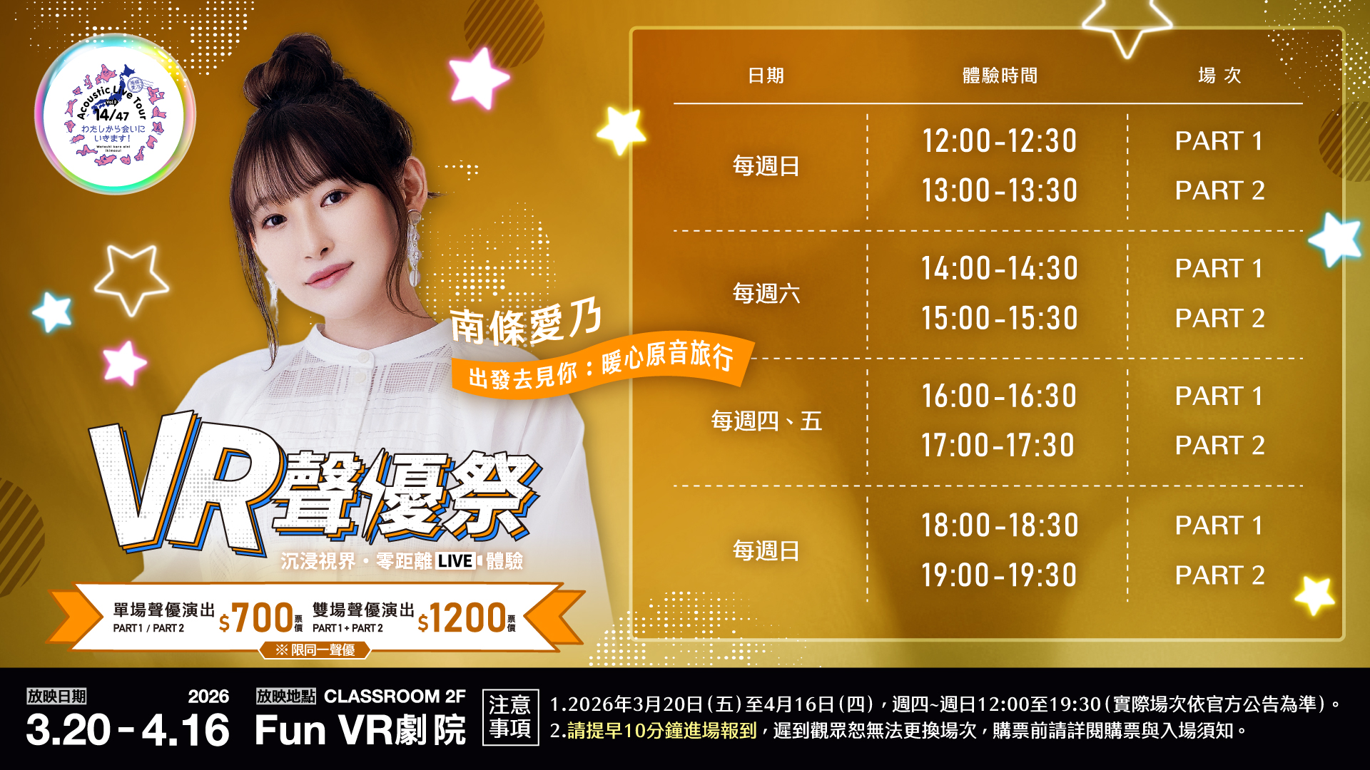 本次卡司邀集日本三位人氣動漫聲優—— 東山奈央 、 小林愛香 、 南條愛乃 ——各自精選代表性Live演出內容,以高解析立體影像與精準收音技術完整重現現場氛圍。