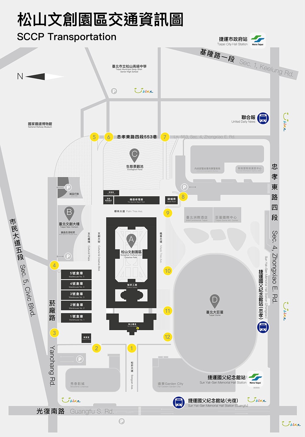 於市民大道及光復南路口,從市民大道於光復南路匝道下,行駛方向由西往東往「菸廠路」駛入 100 公尺後,右側即可看見「松山文創園區」入口。(園內禁止行車,建議停車後步行入園)