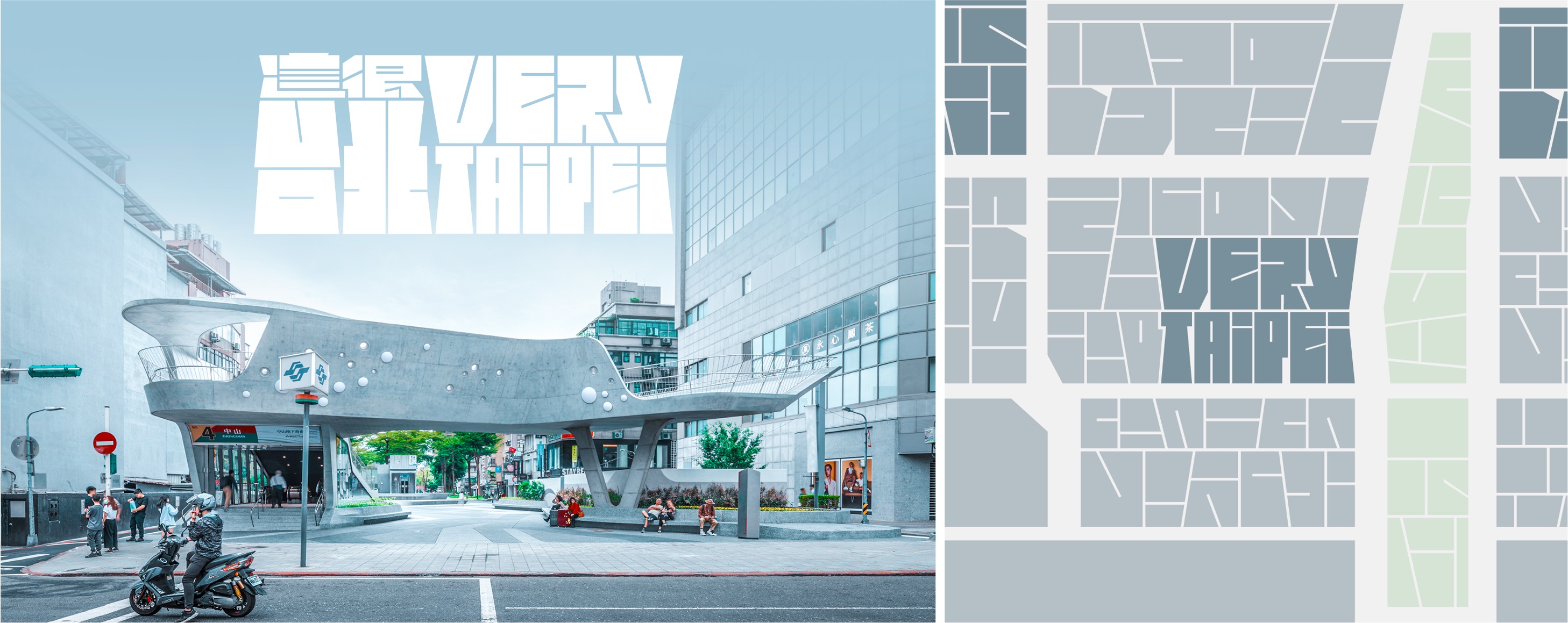《Very Taipei 這很台北-台北捷運線形公園成果設計展》塊狀字體演繹台北不斷堆疊成長的特色。(圖/何庭安)