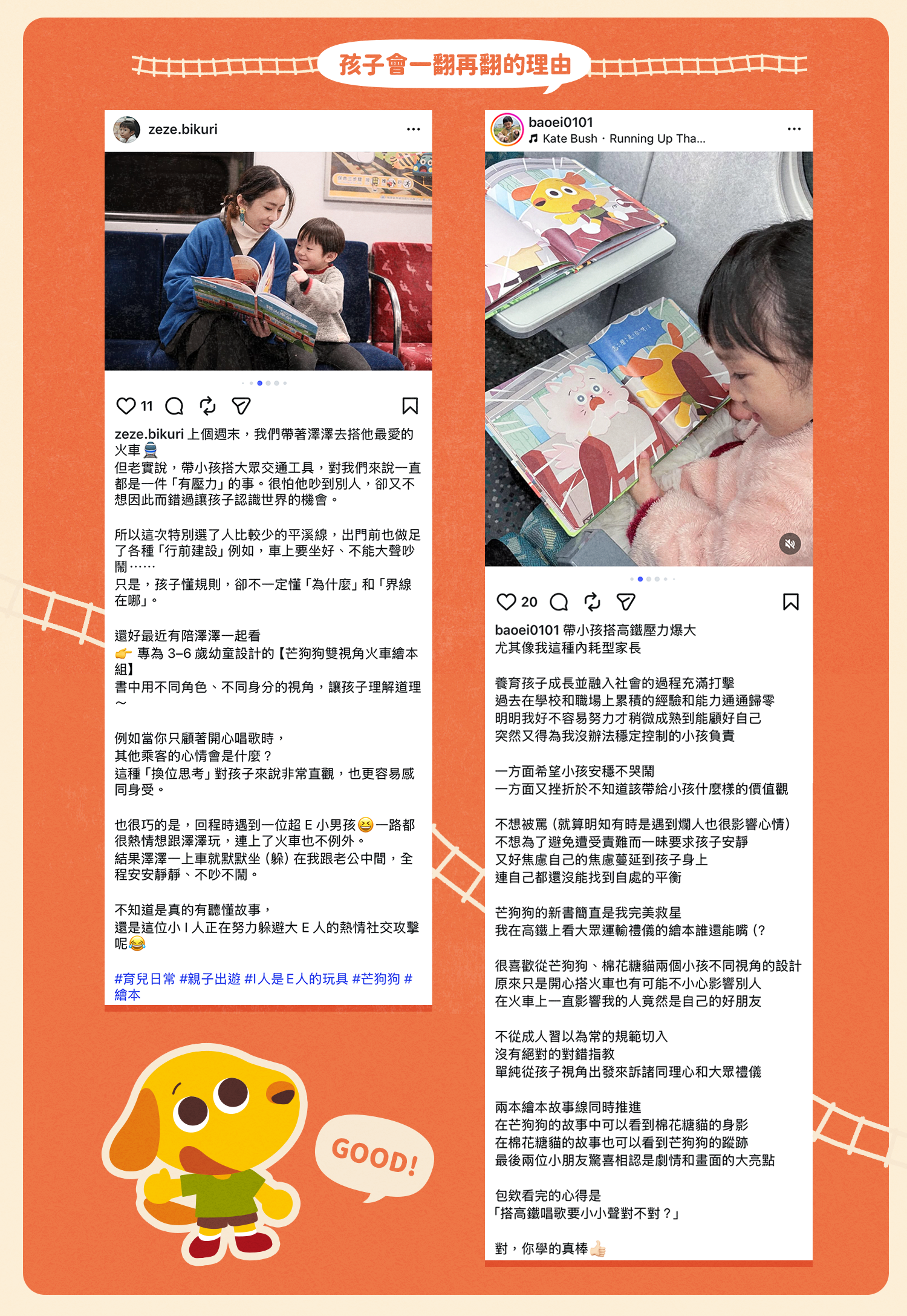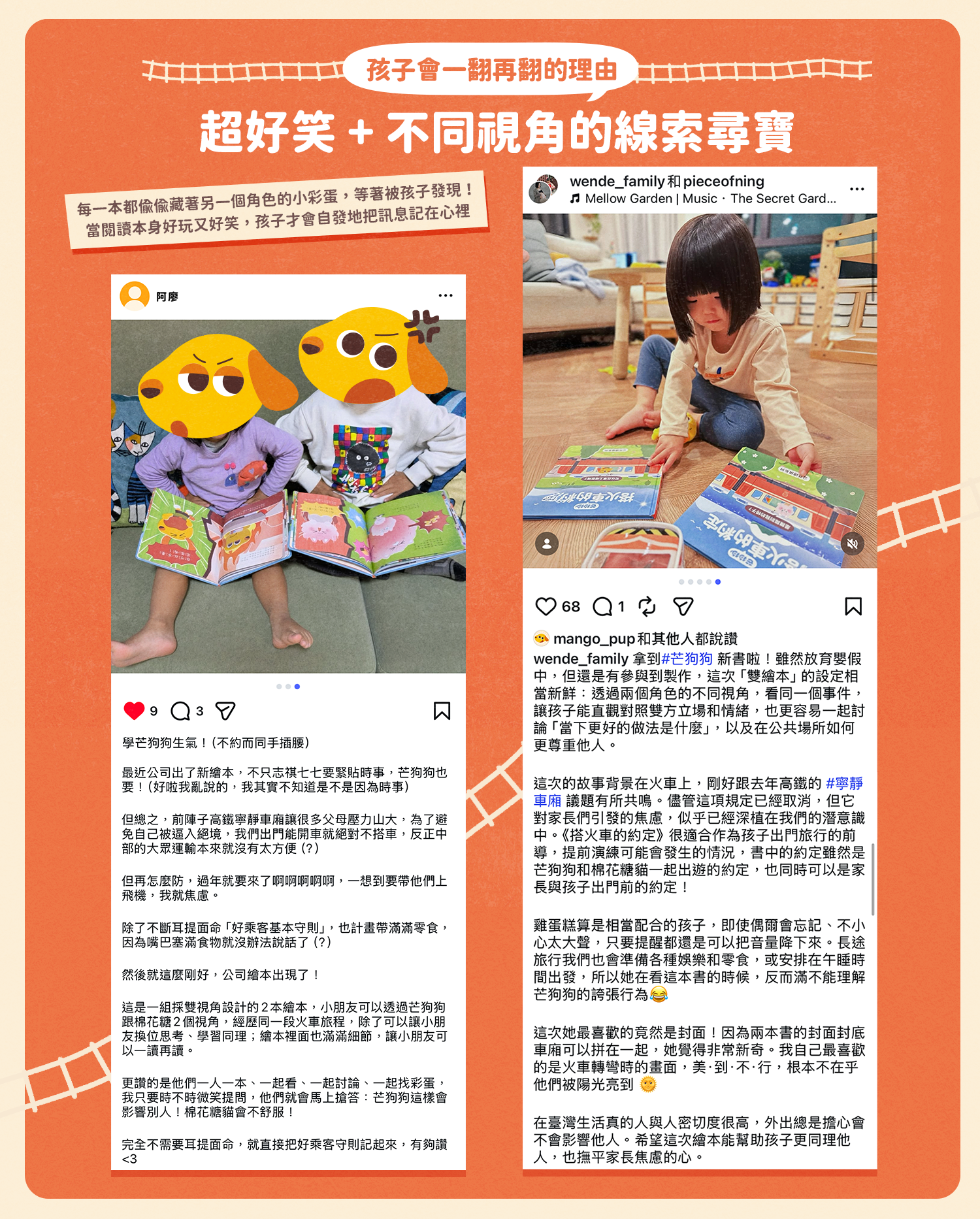 眾多家長見證,雙視角的搭火車趣味故事,深受孩子喜歡,總是主動要求再讀一次繪本!興致勃勃地對照兩本書,找出角色各自隱藏在另一本書中的線索,也被主角們誇張的反應逗樂。孩子因為喜歡而反覆閱讀時,會記得上車要禮讓、不能踢椅背,否則換成自己也會覺得不舒服,讓孩子自然理解「為什麼在公共空間中,需要顧及他人」,也更容易牢牢記住。